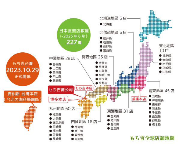 Mochikichi的銷售體系建立在「希望更貼近客戶」的理念上,強調與客戶之間的溝通,始終珍惜著與客戶結緣的成果並以此為願。目前在日本全國擁有226間直營店鋪(2023年11月),在2023年10月29日,我們在台灣設立了第一家非直營店「台灣本店」,同時也是我們在台灣、甚至在海外的第一間分店,我們很高興能將最美味的仙餅,由日本直送至台灣,讓每一位熱愛もち吉的您品嚐。