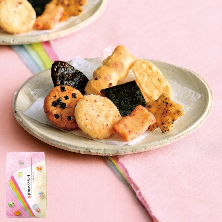 每小包內含以下8款各一:【融雪】黑芝麻 【銀杏並木】起司杏仁 【雪結晶】青海苔 【祈願條】海苔卷 【煙火】海苔點 【白梅】砂糖梅子 【秋海】明太子 【櫻花】紫蘇