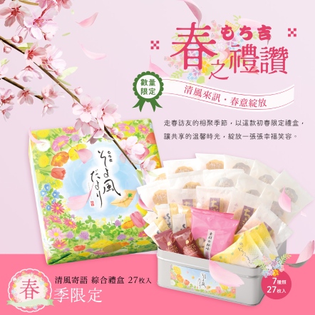 吉仙餅(もち吉 Mochikichi)「清風寄語 綜合禮盒 27枚」,精選六品共七種人氣風味,打造每年春季限定販售的綜合禮盒。歷年春季熱銷好評,今年換上清新設計再次登場。