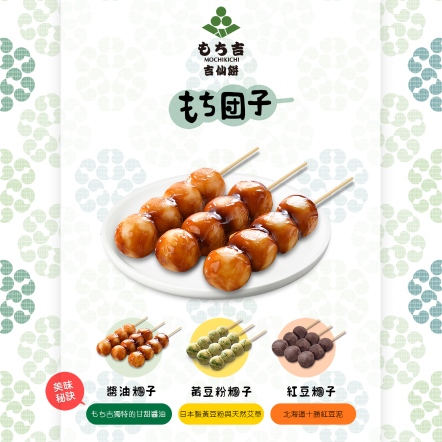 もち吉的串糰子選用日本國產米,搭配日本林務廳認證百大名泉「福智山」泉水為基底,透過百年傳承的製餅匠技,製作出口感與香氣皆屬極品的美味糰子。分別佐以もち吉獨特的甘甜醬油、日本製黃豆粉與天然艾草、以及北海道十勝紅豆泥,三種經典風味,絕對能滿足您對日本串糰子的渴望。