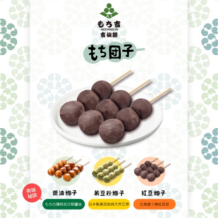 もち吉的糰子選用日本國產米,搭配日本林務廳認證百大名泉「福智山」泉水為基底,透過百年傳承的製餅匠技,製作出口感與香氣皆屬極品的美味糰子。分別佐以もち吉獨特的甘甜醬油、日本製黃豆粉與天然艾草、以及北海道十勝紅豆泥,三種經典風味,絕對能滿足您對日本串糰子的渴望。
